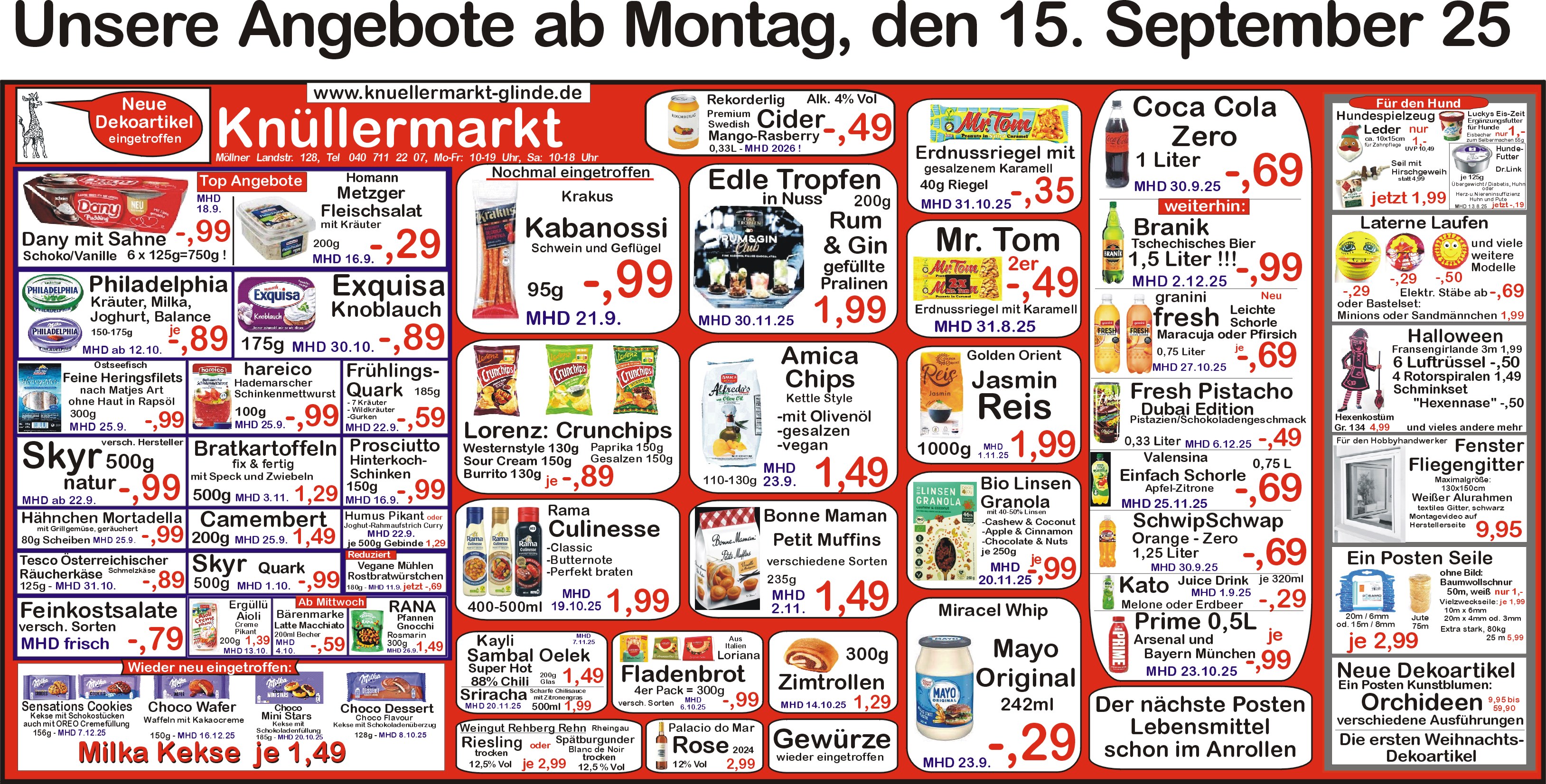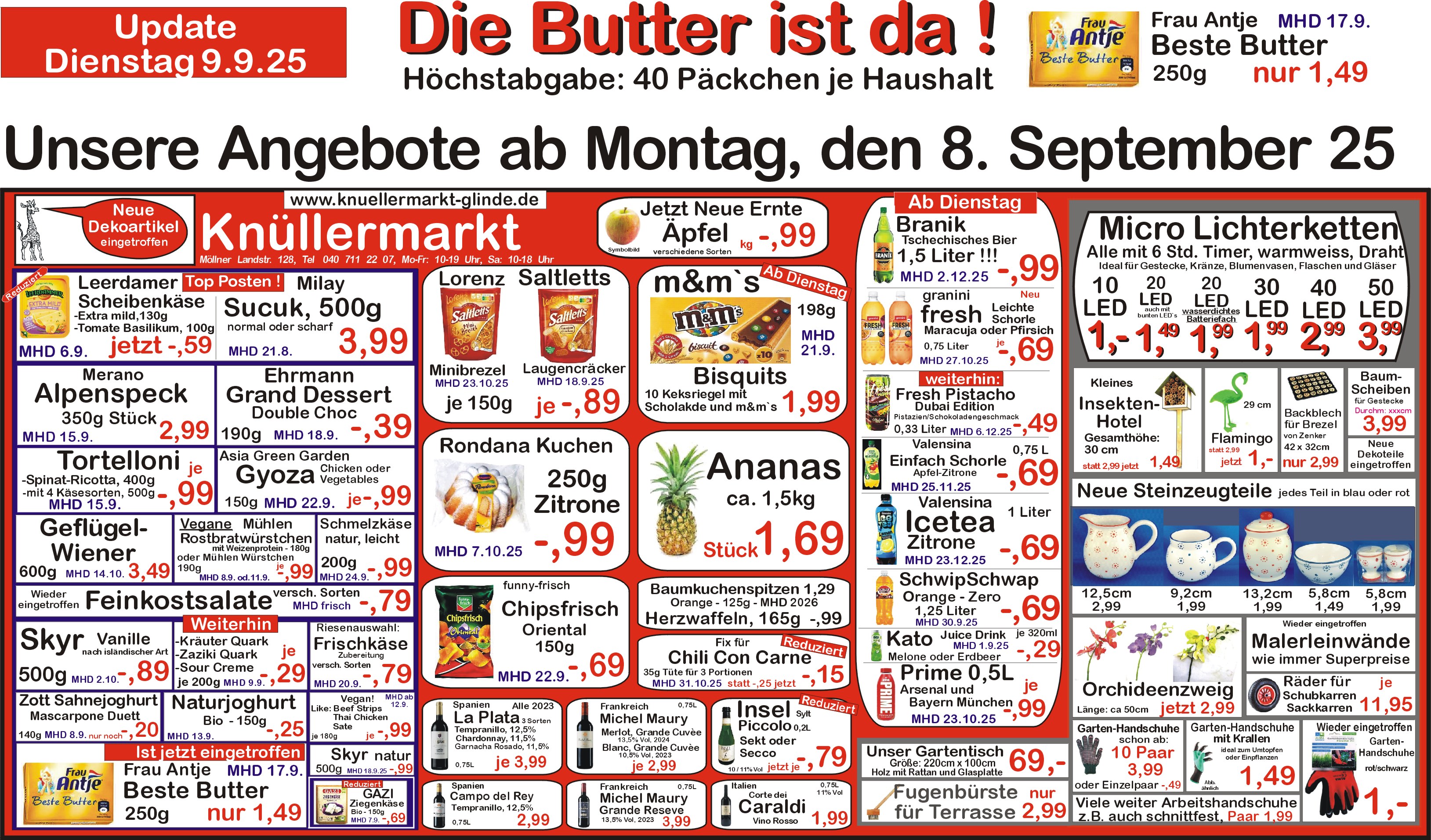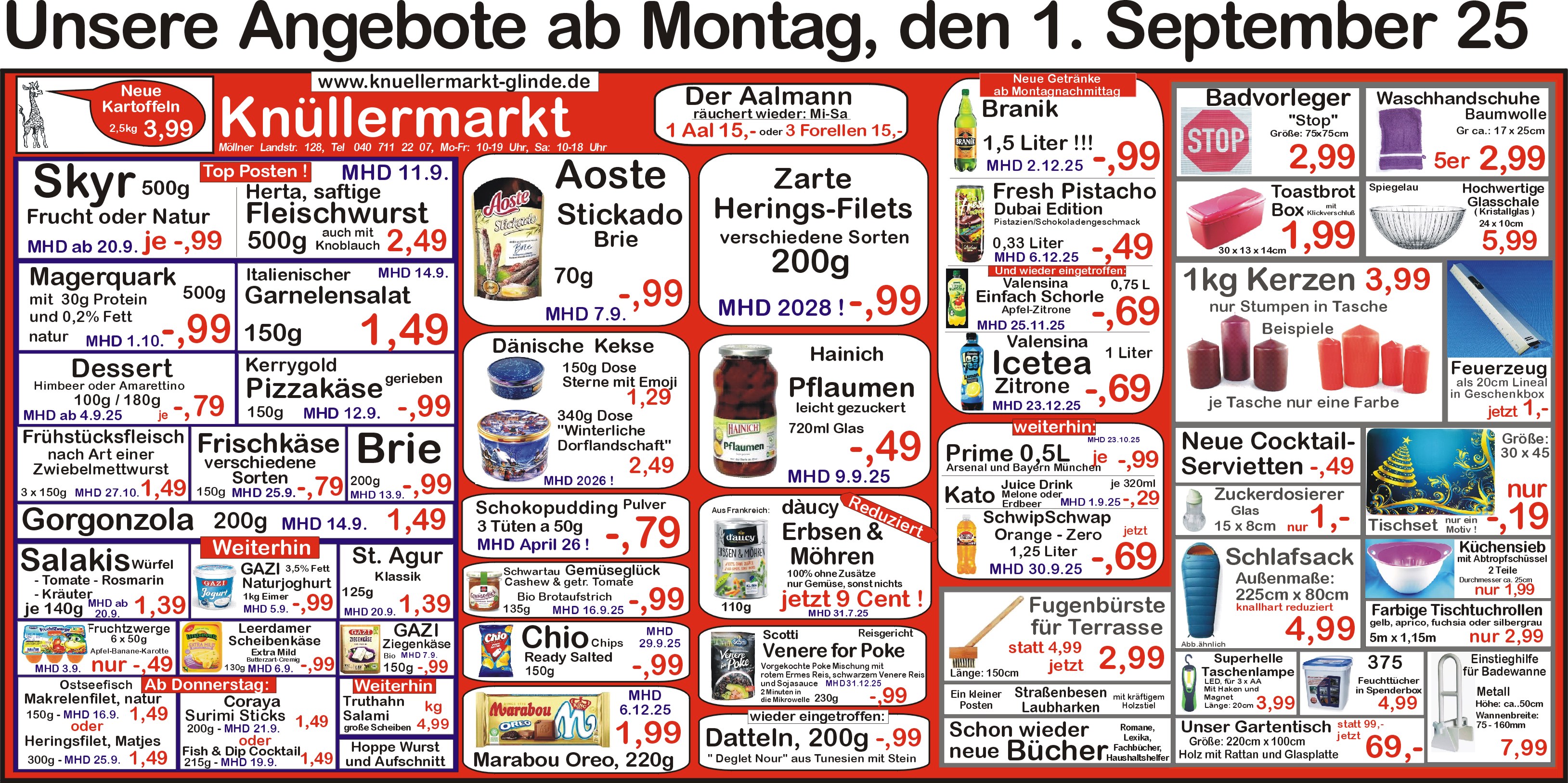 Schul- und Büroartikel: Schulhefte A 4 0,19 Schulhefte A5 0,09 Schnellhefter, Pappe -,50 oder PVC -,20 Briefumschläge, 20 Stück, DIN lang mit oder ohne Fenster Riesenauswahl: Kugelschreiber, Buntstifte, Permanentmarker, Textmarker, CD-Schreiber Schreiblernstifte, Anspitzer, Radiergummis, Prospekthüllen, Klebefilmabroller, Klebefilm, Taschenrechner Ringbücher, Sammelmappen Geodreieck ab 0,59 Metall-Locher schon ab -,49 Heftmaschinen, verschiedene Sorten Verschiedene Kleber, Leim, Sekundenkleber, Spezialkleber